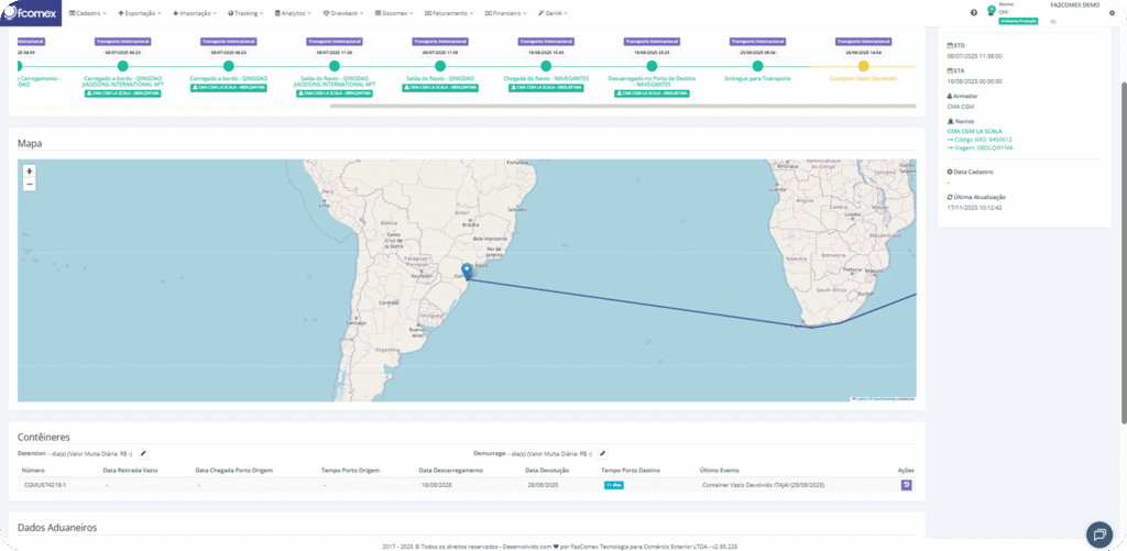 O tracking é totalmente conectado aos demais módulos do FComex, como importação, exportação e financeiro, permitindo a correlação entre os dados logísticos e os documentos de cada operação. Tudo em um painel centralizado e de fácil navegação.